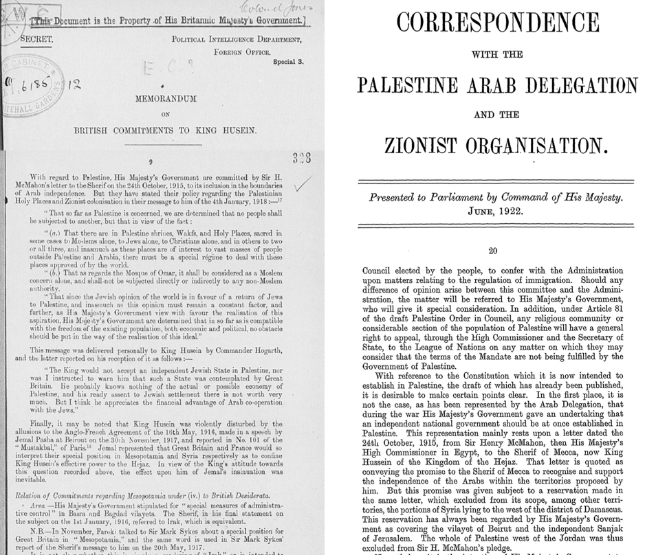 Conflicting British Government interpretations of the Hussein McMahon correspondence of 1915, showing interpretations from 1918 and 1922.