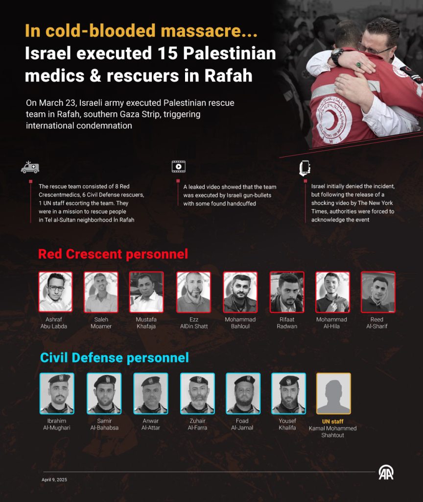On 27 and 30 March 2025, officials found 15 ambulance and firefighting crew members buried 200 meters from their vehicles.