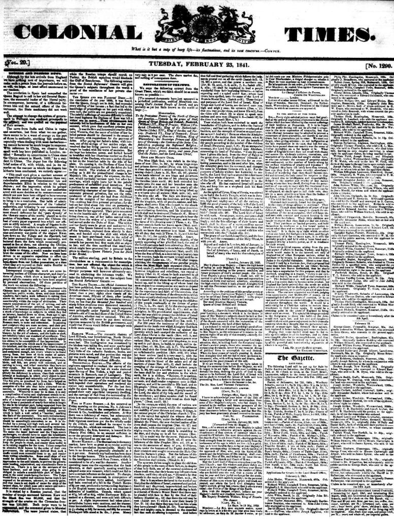 Description: “Memorandum to the Protestant Powers of the North of Europe and America”, Colonial Times (Hobart, Tasmania, Australia), 23 February 1841, page 1, column 3. Reprinted from The Times (London), 26 August 1840, pp. 5-6.